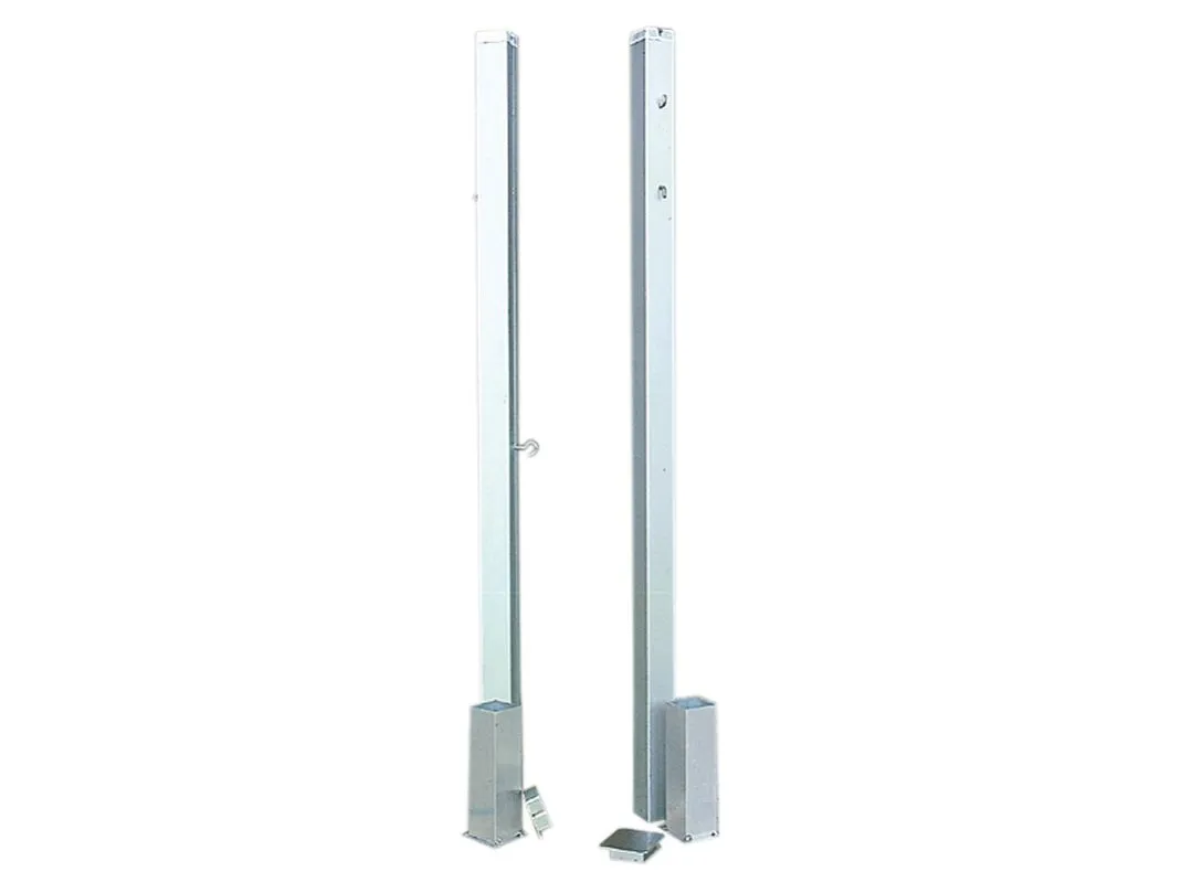 Sehr robuste Aluminium-Badmintonpfosten für den Trainings- & Freizeitbereich als Alternativlösung zu den frei aufstellbaren Badmintonpfosten. Diese hat sich bereits durchgesetzt, da auf den meisten Hallen- und Freiplatzspiefeldern bereits Bodenhülsen für Tennis und Volleyball vorhanden sind. Die Oberfläche ist eloxiert, und Netz- und Spannhaken sowie Bodenhülsen rosten nicht. Das 80 x 80 mm Profil hat keine Spannmechanik, sondern lediglich Netz- und Spannhaken. Die Eisnstecktiefe der Bodenhülsen beträgt 350 mm. Geprüft nach EN 1509, Klasse C. Inkl. Abdeckkappen.