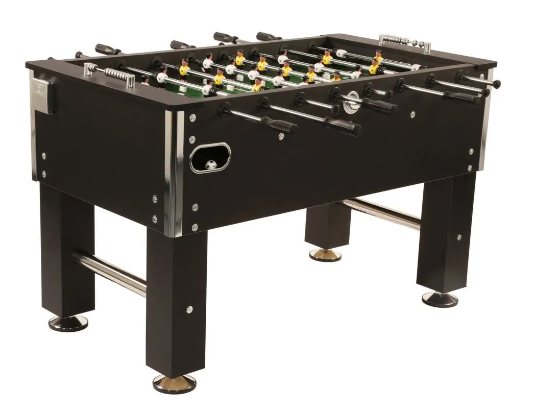 Der Fußball Kicker Profi-Soccer deluxe ist ein robustes Tischfussball Spiel in edlem Design mit chromfarbenen Blenden am Korpus und Ballauslauf. Die ca. 15 mm starke Spielplatte mit den hochgezogenen Turnier-Spielfeldecken sorgt für ein schnelles dynamisches Spiel.