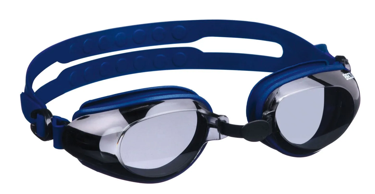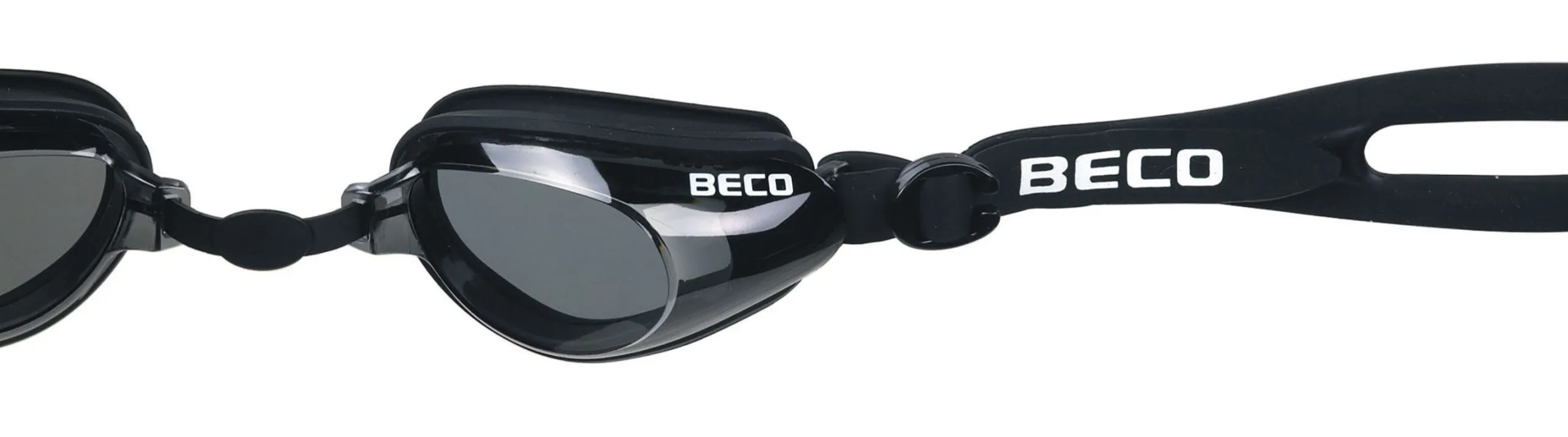 Schwimmbrille mit geteiltem Kopfband und verstellbaren Nasensteg für einen optimalen Sitz.