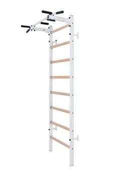 Hochwertige Sprossenwand mit Metallprofilen und mit 8 ovalen Buchenholz-Sprossen (30 x 40 mm) in den Maßen 230 cm x 67 cm. Die Sprossenwand entspricht der Norm EN 913 und der Norm EN 12346 und muss an die Wand montiert werden. Tolles Sportgerät und ideal auch für den Heimgebrauch. Mit fest angebrachter Klimmzugstange aus Metall, auch zum Einhängen eines Schlingentrainers.