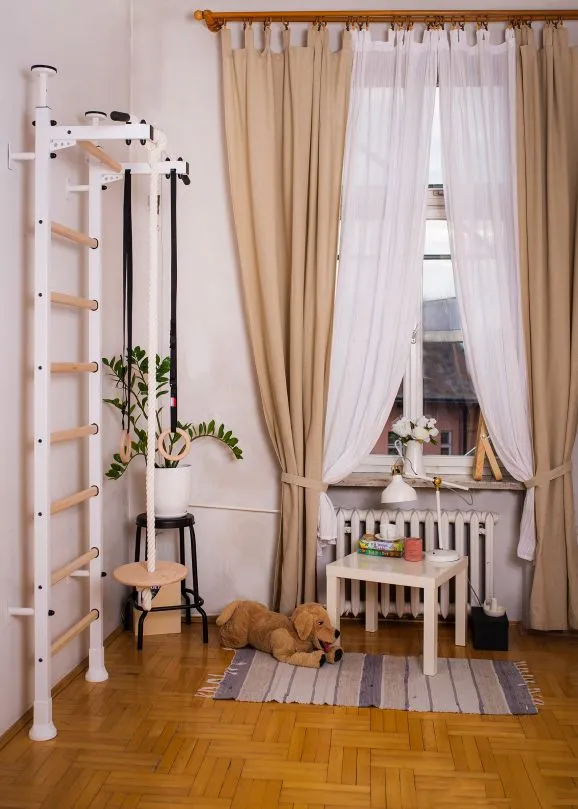 Das Set besteht aus einer Sprossenwand, einer Klimmzugstange aus Metall, Turnringen aus Holz und einem Baumwollseil mit einer Holzschaukel.