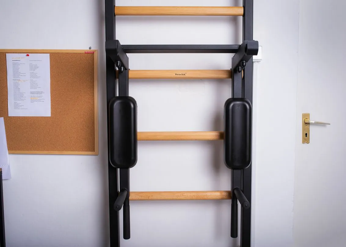 Hochwertige Sprossenwand in den Maßen 67 x 230 cm mit Metallprofilen und mit 8 ovalen Buchenholz-Sprossen (30 x 40 mm). Die Sprossenwand entspricht den Normen EN 913 und EN 12346 und kann entweder an die Wand montiert werden, oder alternativ an Boden- & Decke befestigt werden. Tolles Sportgerät und ideal auch für den Heimgebrauch. Fest angebrachte Klimmzugstange aus Metall, verstellbarer Dipbügel inkl. Armlehnen und eine Trainingsbank zum Einhängen erweitern Ihre Trainingsmöglichkeiten.
