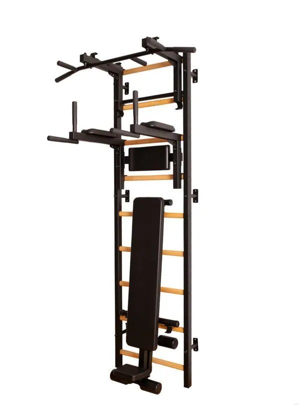 Die Sprossenwand zeichnet sich mit modernen und hochwertigen Design aus. Die zusätzlichen Elemente bestehen aus einer multifunktionellen Klimmzugstange mit Hantelstangenhalterung, verstellbarem Dipbügel inkl. Armlehnen und einer Trainingsbank zum Einhängen. Jedes zusätzliche Element ist höhenverstellbar und bietet eine Vielzahl an Trainingsmöglichkeiten. Die Sprossenwand entspricht der Norm EN 913 und der Norm EN 12346 und wird an der Wand montiert.