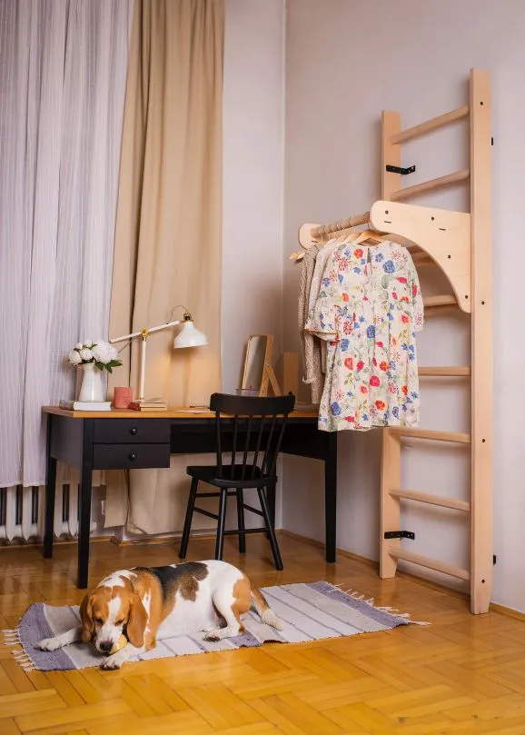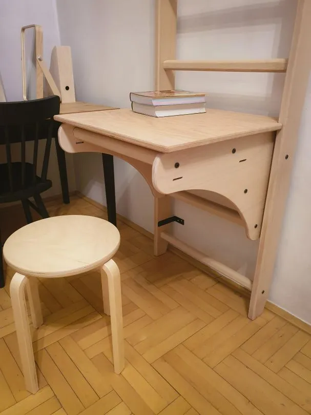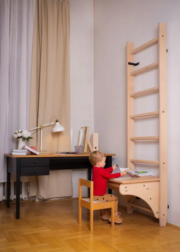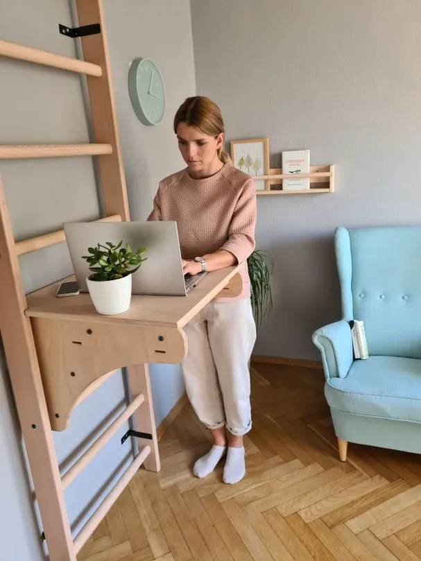 Abnehmbare Schreibtischauflage als Zubehör für die Klimmzugbügel PB204. Nach der sportlichen Einheit bietet diese Tischplatte eine höhenverstellbare Ablage- oder Nutzfläche an der Sprossenwand.
