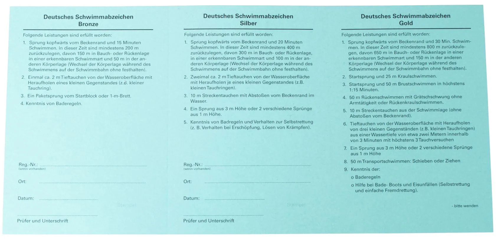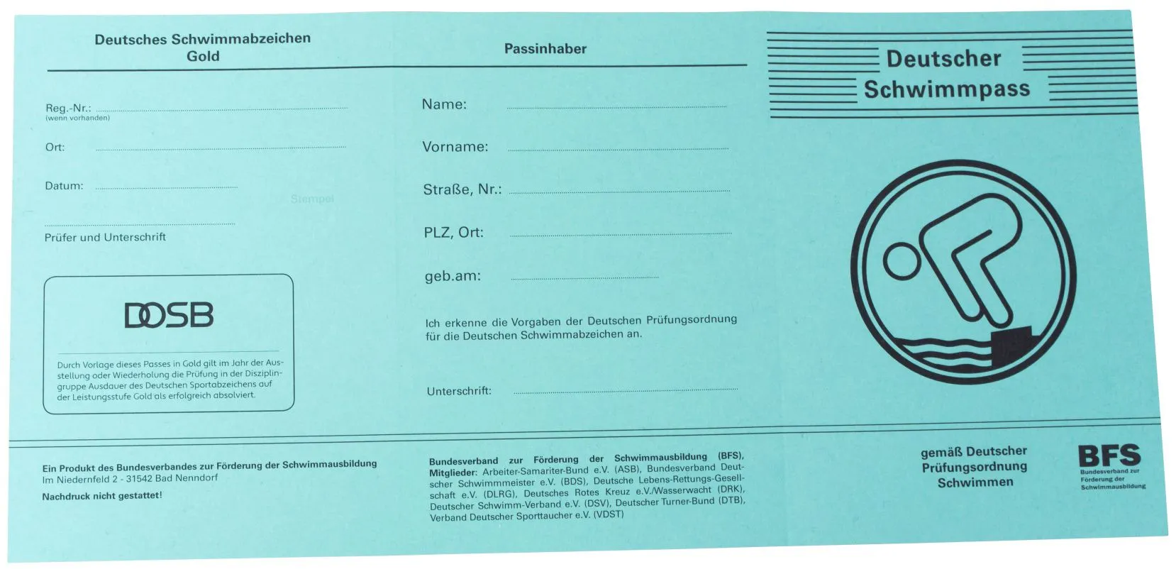 Der Schwimmpass (grün) bietet neben den beschriebenen Anforderungen für das Schwimmabzeichen Bronze/Silber/Gold Leerzeilen für den Passinhaber, Ort, Datum, Prüfer und Nummer.