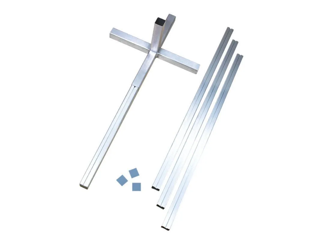 Die freistehenden Bodenhülsen bestehen aus einem 5-teiligen Set mit einem Hülsenkreuz sowie 4 Hohlprofil-Auslegern (3 Stk. 250 cm und 1 Stk. 100 cm). Diese müssen mit Sand befüllt und bedeckt werden. Die breite Standfläche und das Gewicht des Sandes sorgen für absolute Standsicherheit.