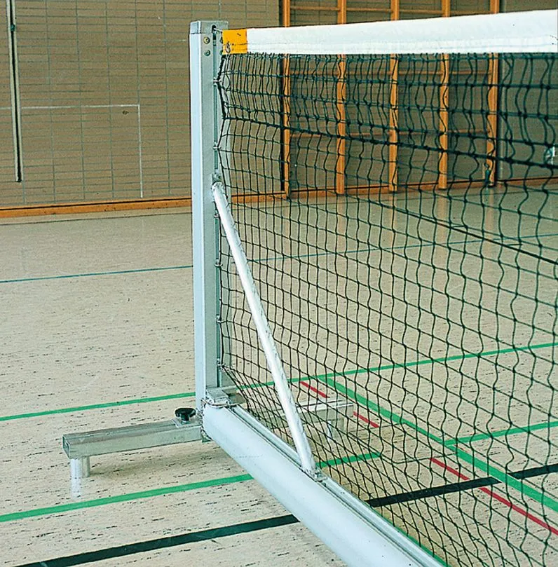 Freistehende Anlage für die offizielle Netzgröße 12,72 x 1,07 m. Die mobile Tennisanlage eignet sich auch für den Schul- und Breitensport und ist überall einsetzbar, auch in der Turnhalle. Eine raumsparende Aufbewahrung ist dank der anklappbaren Netzpfosten, der Standfüße und des teilbaren Bodenauflegers möglich. Leichter auf- und abbaubar, geringes Gewicht. Ohne Netz, Netzstützen und Regulierband.