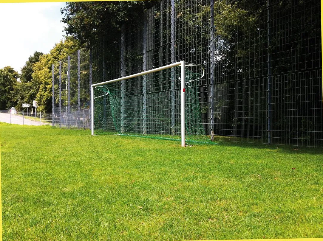 Zusätzliche Eckstabilisierung durch Flacheisenwinkel der Netzbügel, bündig in der Torprofilnut liegend und verschraubt. Sicherheits-Netzhalter mit Doppelhaken aus verschleißfestem Kunststoff, vertieft in der Profilnut liegend, leicht auswechselbar, für schnelles Anbringen und Abnehmen der Netze. Zum Einstellen in Bodenhülsen. Komplett mit Bodenhülsen und Abdeckkappen, ohne Netze.