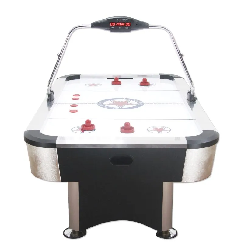 Unterhalb der Spielfläche befindet sich ein leistungsstarkes 220 V Gebläse, das durch die Löcher in der Spielfläche Luft bläst und so ein Luftkissen aufbaut. Dadurch gleitet der Puck nahezu widerstandslos über die Spielfläche. Ein elektronisches Display mit integrierter Soundfunktion befindet sich zentral über der Spielfläche, um den Spielstand immer im Blick zu haben. Bei jedem erzielten Tor wird ein Sound abgespielt, um das Spielerlebnis noch spannender zu gestalten. Der Airhockey Stratos verfügt auch über einen praktischen Puck-Auffangkorb hinter den Torkästen, der eine schnelle und einfache Entnahme des Pucks ermöglicht.