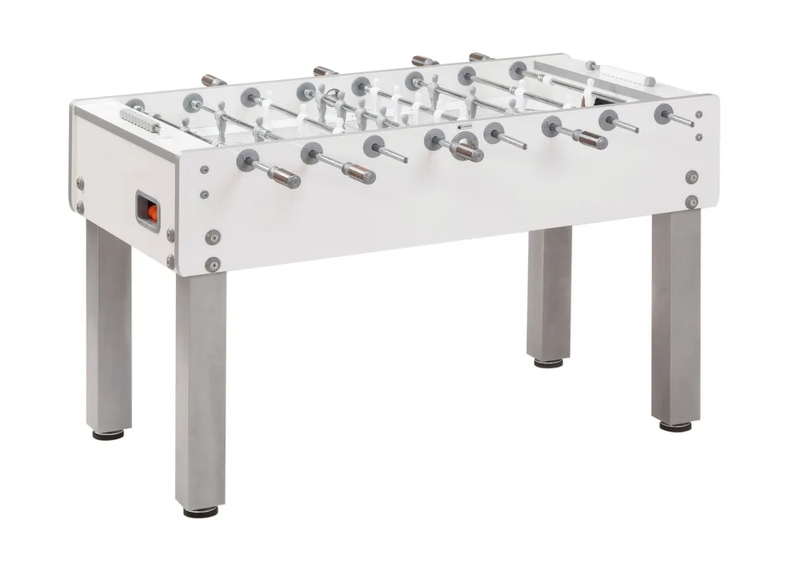 Profi Tischkicker in elegantem weißem Hochglanz Design mit besonders solider und stabiler Tischkonstruktion. Der 25 mm starke MDF-Tischkorpus verfügt über eine stoß- und kratzfeste Resopalbeschichtung, die trotz der weißen Hochglanz-Optik äußerst strapazierfähig ist. Die 9 x 9 cm stabilen Metalltischbeine sind in der Farbe silber dem Tischdesign angepasst und mit höhenverstellbaren, rutschfesten Tellerfüßen ausgestattet. Der Kicker lässt sich selbst bei Bodenunebenheiten perfekt justieren und erhält dadurch eine besonders hohe Standfestigkeit. So kommen die hervorragenden Spieleigenschaften des Tisches voll zur Geltung!