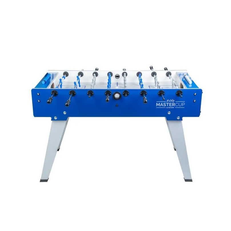 Das besondere an dem Modell „Foldy“ besteht darin, dass die Tischbeine so konstruiert sind, dass sie mit wenigen Hangriffen eingeklappt werden können und der Kickertisch nach Spielende hochkant stehend platzsparend verstaut werden kann. Die schrägen 30 mm starken MDF-Tischbeine sorgen für hohe Stabilität, die durch eine zusätzliche Blende nochmals verstärkt werden. Die Bälle können bequem aus den integrierten Torkasten jeder Stirnseite entnommen werden.