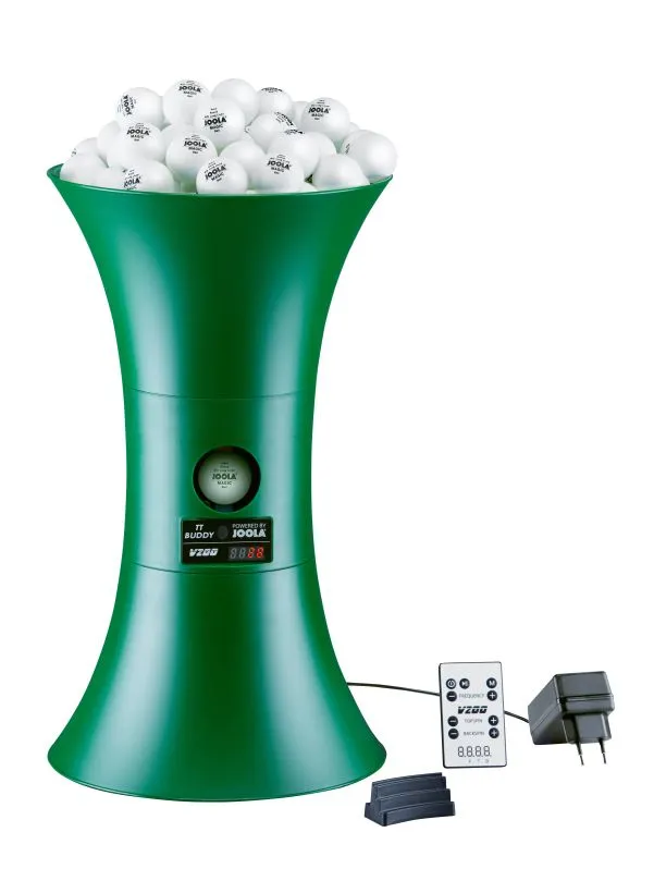 Wirft Unterschnitt-, Topspin- und Konterbälle aus. Ballfach für 100 Bälle. Optimaler Trainingspartner für Hobby- oder Vereinsspieler. Variable Auswurffrequenz zwischen 12 und 70 Bälle/Min. Einfache Bedienung und stufenlose Regulierung. Maße: 48 x 28 x 28 cm.