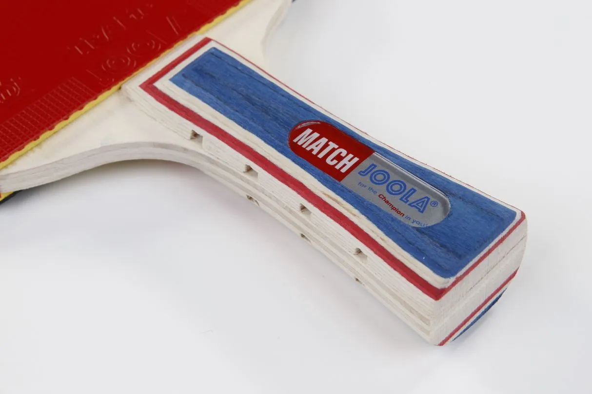 Dieser Joola Tischtennis Schläger ist für Einsteiger ausgelegt, die bereits erste Techniken kennen und nicht das erste Mal Tischtennis spielen. Joola Einordnung der Kategorie: Learn. Der Schläger hat folgende Technologien: Ergo Grip für einen ergonomischen Griff, der sehr gut in der Hand liegt. Der Griff ist konkav. Selected Plywood ist eine Technologie bei der die Furnierkombination sorgfältig abgestimmt wird, um so bestes Ballgefühl und höchstmögliches Tempo beim Schlag zu erreichen. Als dritte Technologie hat der Schläger Match das Control System, beim dem quer angeordnete Ausfräsungen im Schlägergriff die Vibrationen vollständig ausschalten. Die Ballkontrolle wird somit nochmals erhöht. Der Tischtennisschläger hat einen ITTF-zugelassenen Belag (TRAMP) mit einem 1,7 mm starken Schwamm, Noppen auf der Innenseite. Das Furnier ist aus 5-fach verleimten Spezial-Sperrholz. Der Schläger hat die Einordnung Tempo 68, Effet 73 und Kontrolle 93.