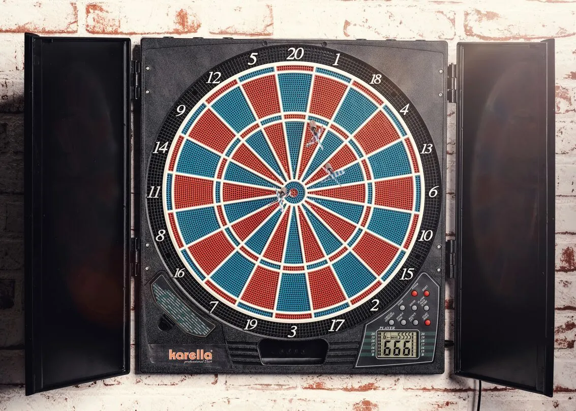 Der Karella® CB-25 Dartautomat ist eine 2-Loch Dartscheibe mit Turniermaßen. Die Segmente sind in Blau und Rot gehalten und die Spinne in weiß. Das Modell DB-25 hat zwei Schranktüren und Dartpfeilhalterungen im Rahmengehäuse. Der Dartautomat bietet 29 verschiedene Spiele mit 90 Spielvarianten an.