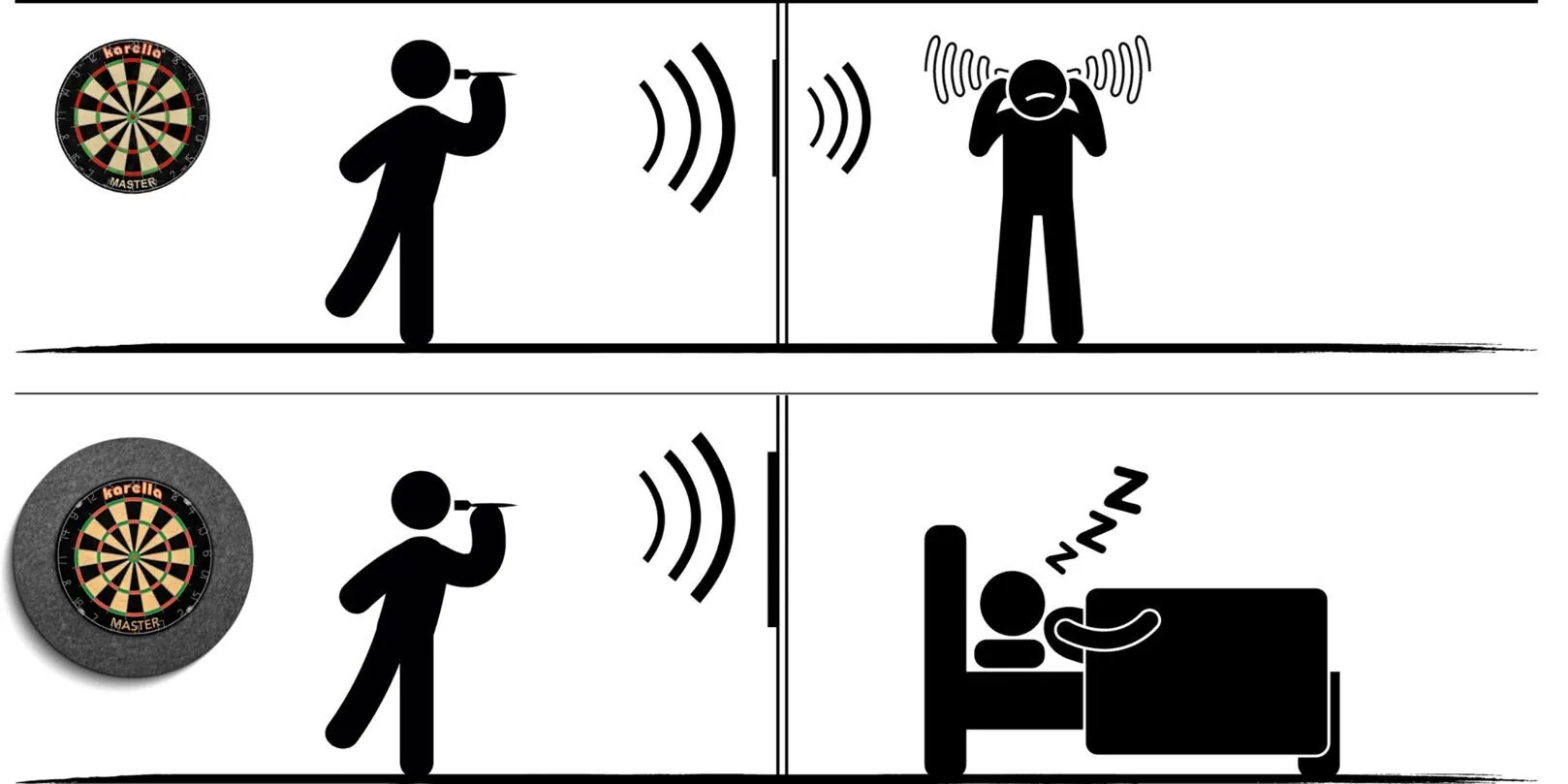 Der 2-teilige Karella® Schallschutz besteht aus einem Schallschutzkern, auf dem die Steeldart-Dartscheibe befestigt wird, und einem umgebenen Schallschutzring. Beide Teile werden aus Millionen, hoch spezialisierten Schallschutzfasern hergestellt. Durch das Zusammenspiel vom Schallschutzkern und dem umgebenen Schallschutzring gelingt eine nahezu vollständige Geräusch Entkopplung. Beim Auftreffen des Dartpfeiles wird das dumpfe Klopfgeräusch über die Dartboard Rückseite auf die gesamte Faserplatte übertragen. Bei professionellen Messungen konnte eine Geräuschreduzierung von über 80% im Dart-Raum sowie auch angrenzenden Räumen nachgewiesen werden. Die gemessenen Werte lagen unter 30dB und damit bleibt die gesetzliche Nachtruhe zu 100% unberührt.
