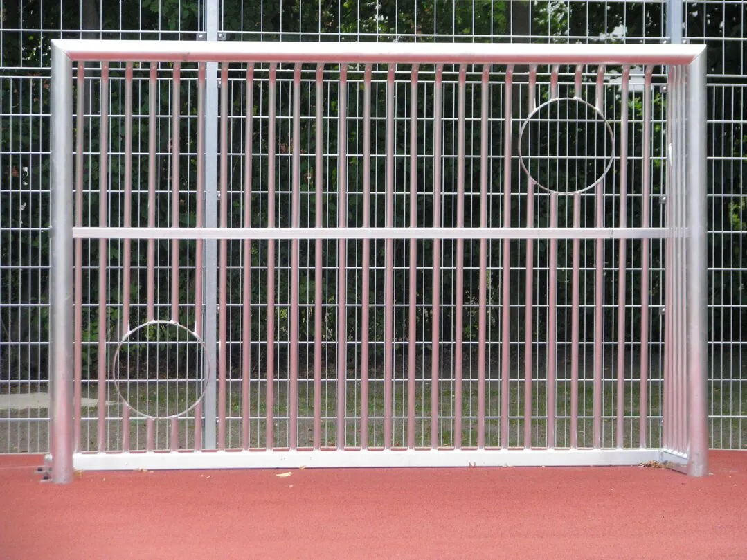 Die integrierten Ballausschnitte machen das robuste, vandalismussichere Tor zusätzlich attraktiv, besonders für öffentlich zugängliche Outdooranlagen wie Bolzplätze, Spielplätze oder Pausenhöfe. Zudem ist das Tor in Verbindung mit den mitgelieferten Bodenankern sicherheitsgeprüft und entspricht der DIN 15312.