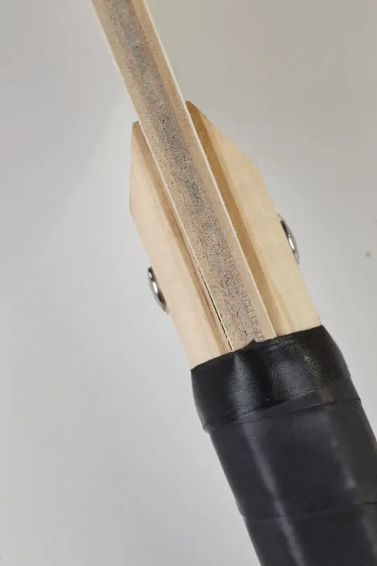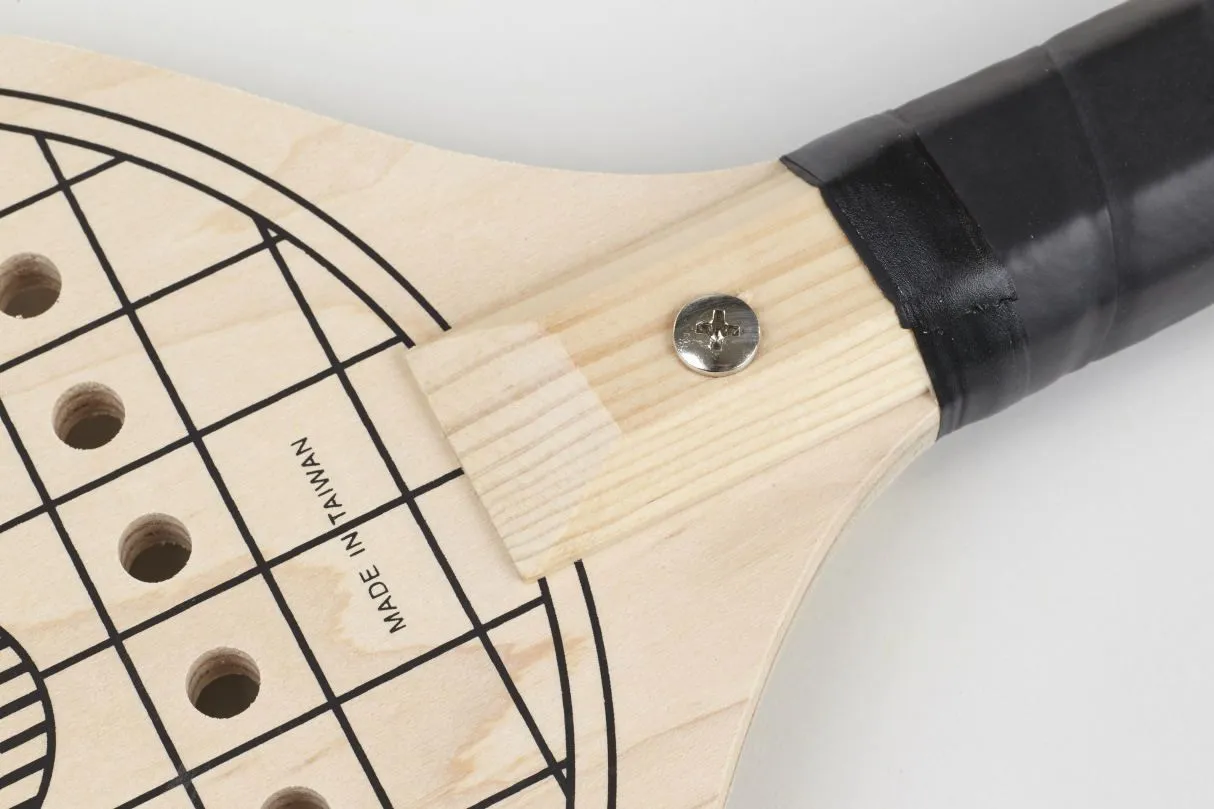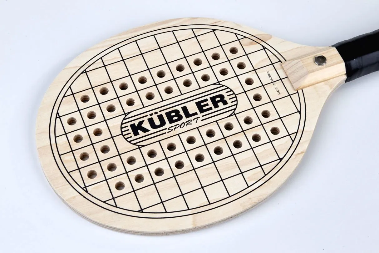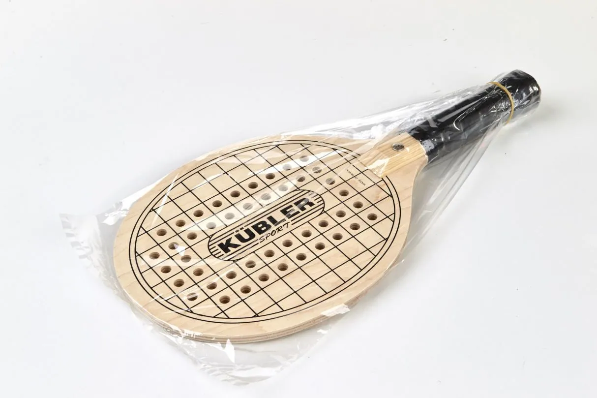Einzelner Speckbrettschläger aus mehrfach verleimtem Schichtholz. Das Schlägerblatt ist ca. 20 x 24 cm groß, gelocht und liniert. Der Griff der Schläger ist mit einem Kunstledergriffband umwickelt. Zum Schutz der anderen Spieler ist jeder Schläger mit einer Fangschlaufeversehen.