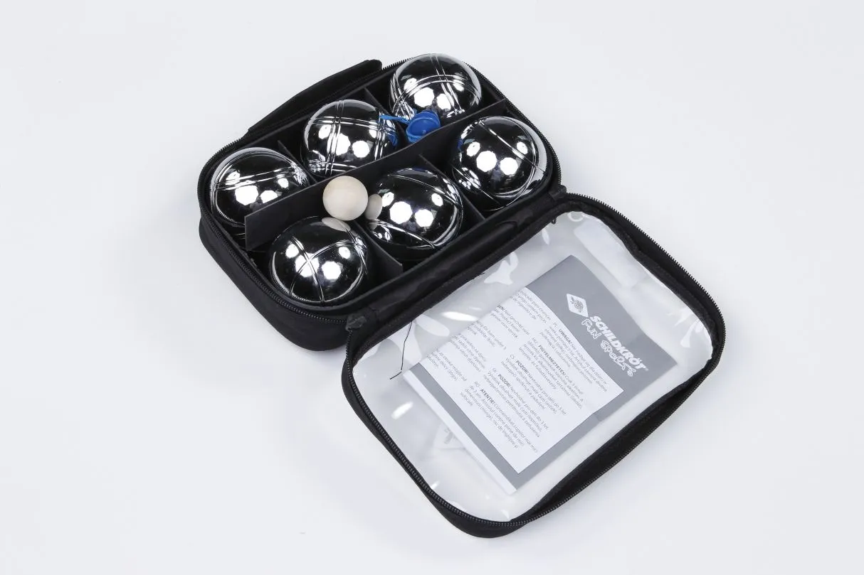 Boule Set aus 6 Kugeln für 2 Spieler. Die Boule oder Pétanque Kugeln aus Stahl sind mit zwei unterschiedlichen Markierungen versehen, damit die Kugeln nach den Würfen auch auseinandergehalten werden können. Das Boule Set besteht aus 3 x 2 Kugeln aus Metall mit einem Ø 7,25 cm, 1 Zielkugel aus Holz, einem Abstandsmesser und einer schwarzen Nylontasche mit Tragegriff.