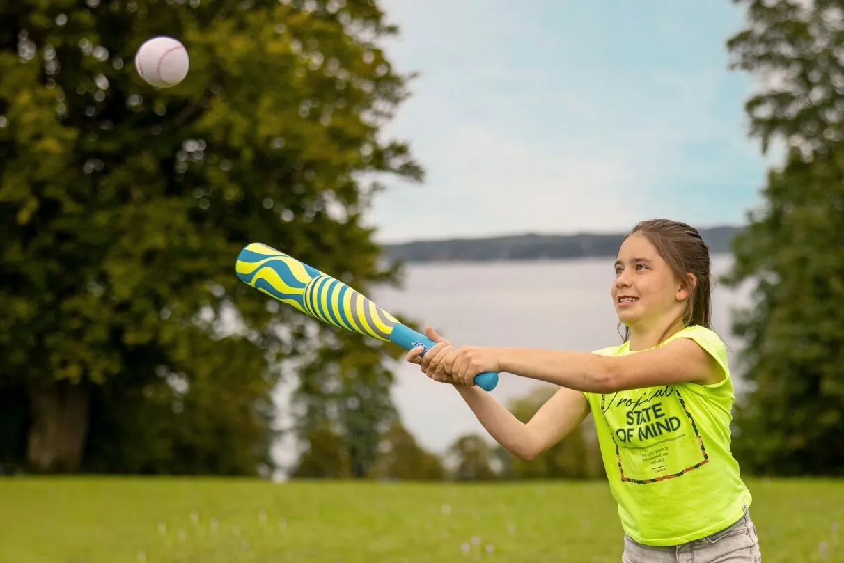 Weicher Baseballschläger von Schildkröt (62 cm, 200 g). Im Kern ist ein dünnes Kunststoffrohr, das mit Schaumstoff ummantelt und dann mit griffigem Neopren überzogen ist. So können schon die jüngeren ungefährlich an diesen coolen Sport herangeführt werden. Das Set ist salzwasserfest und somit auch ein beliebter Begleiter für Strand und Meer. Das griffige, textile Neopren liegt super und sicher in der Hand. Durch die weiche Konstruktion ist das Set weitgehend ungefährlich.