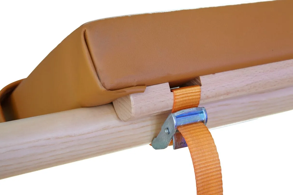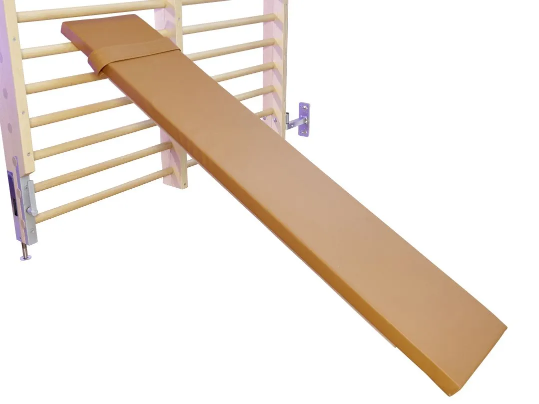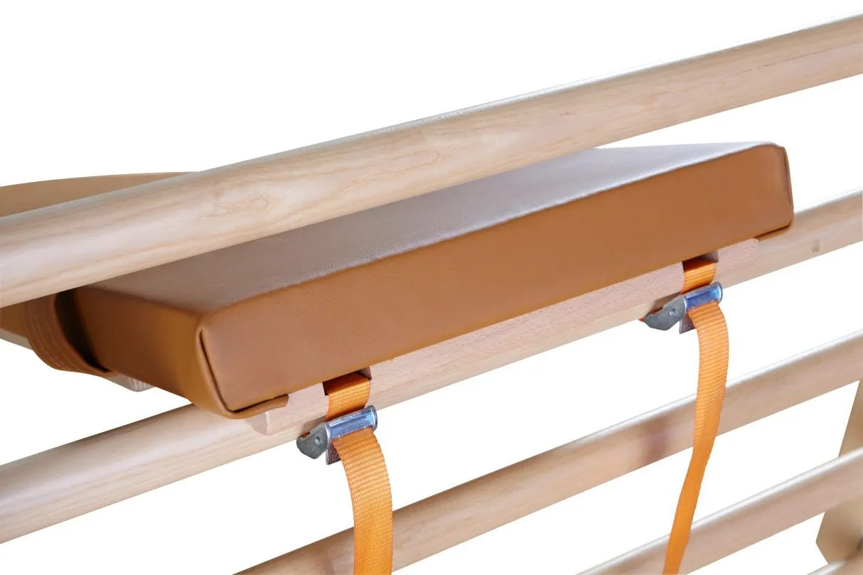 Das Schrägbrett ist zum Einhängen in Sprossenwände geeignet und wird inklusive eines Fußhaltegurts geliefert.