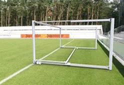 Das Schwenktor (Jugendtor 5×2 m) ist in Bodenhülsen außerhalb des Spielfeldes einbetoniert und kann durch das angebrachte Rollsystem von einer Person problemlos zur Seite geschwenkt werden. Der Bodenrahmen ist hochklappbar und ein Aluminium-Rechteckprofil mit 75 x 50 mm. Die hintere Torhalterung ist ebenfalls ein Rechteckprofil mit den Maßen 80 x 80 mm. Die Einstecktiefer der Bodenhülsen ist 350 mm.