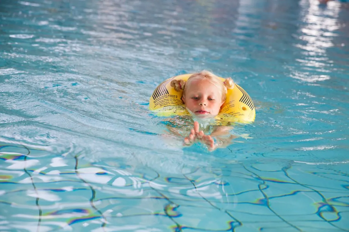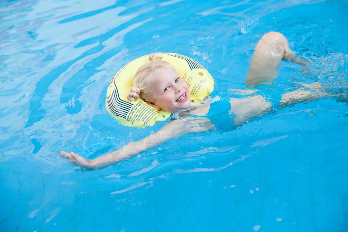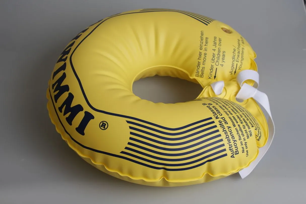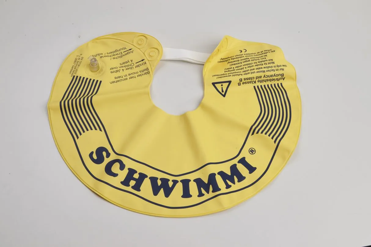 Der Schwimmkragen hält den Kopf über Wasser. Wie funktioniert es? Die Ventile für das Aufblasen mit dem Mund leicht zusammendrücken und anschließend mit dem Stopfen verschließen. Die Bänder je nach Halsumfang in die hinteren oder vorderen Löcher einziehen und eine feste Schlaufe binden. Nach Gebrauch mit klarem Wasser abspülen und trocknen lassen.