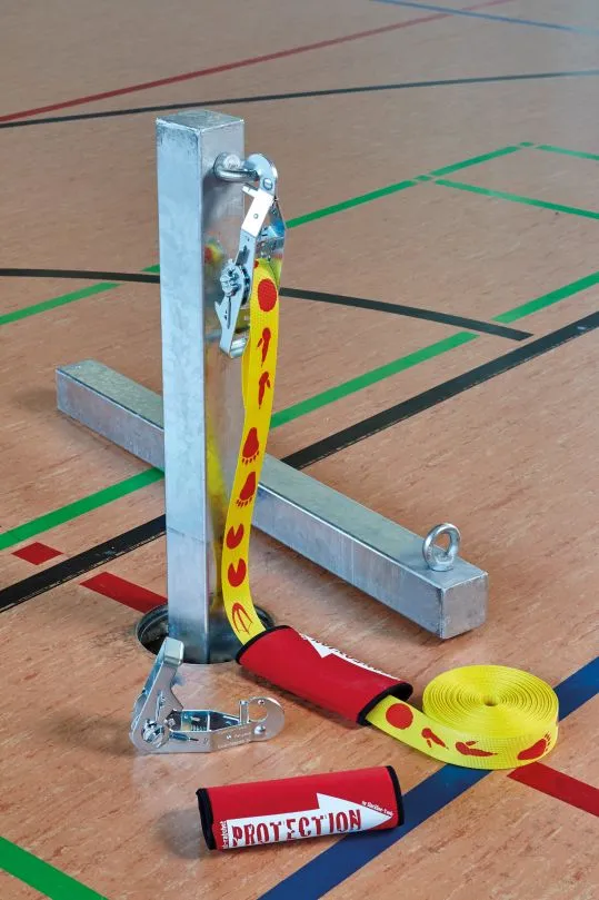 KIDS II: Slackline Pfosten, 90 x 90 mm mit jeweils 2 Ösen (Anschlaghöhe ca. 70 cm und 90 cm, bei 30 cm Einstecktiefe) zum Einhängen der beiden Clip-Ratschen. Slackline jeweils 45 mm breit in attraktivem und ansprechenden gelb/rotem Design.