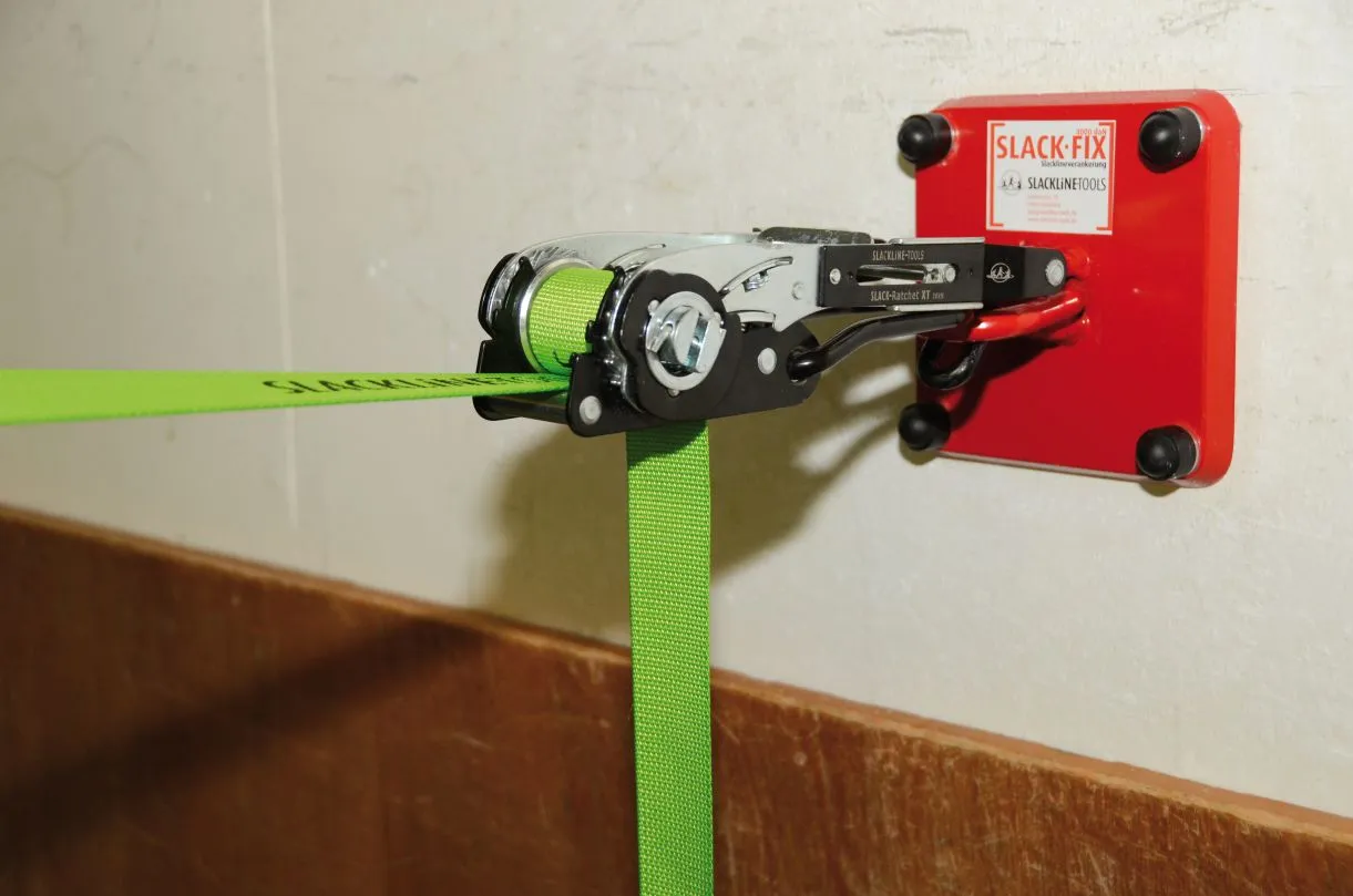 Komplettes Slacklinesystem inklusive Wandbefestigung für Kindergärten, Kitas, Schulen, Vereine, Sport- und Kletterhallen, Fitnessstudios und Physiotherapiepraxen. Die Wandverankerungen aus Stahl können drinnen wie draußen auf Beton angebracht werden. Die Ratschen lassen sich bequem einklippen und die Slacklines sind im Handumdrehen einsatzbereit. Die Wandanker mit dem abklappbaren Bügel haben entsprechend der DIN 79400 Slacklinesysteme eine Bruchlast von 4000 daN.
