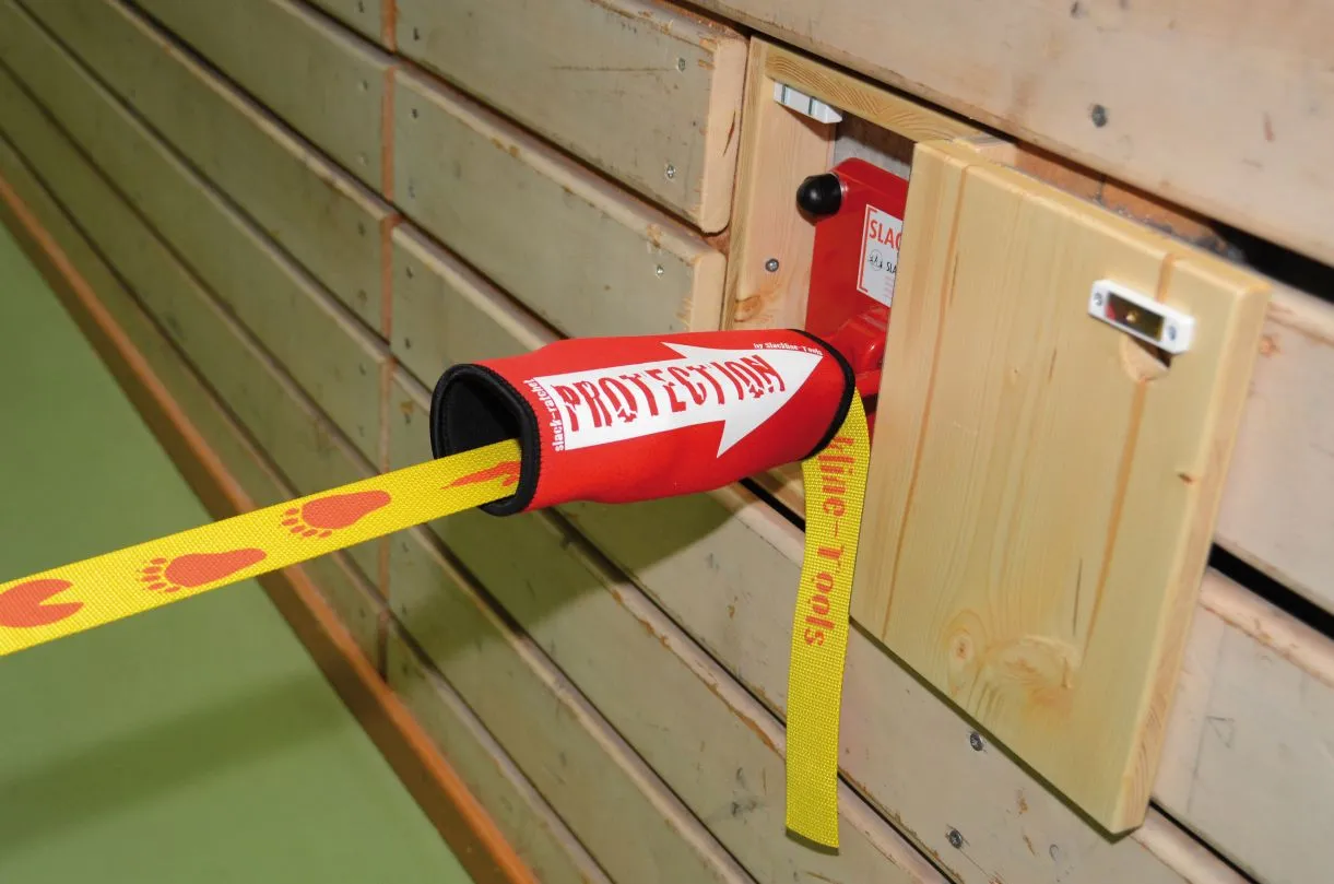 Komplettes Slacklinesystem inklusive Wandbefestigung für Kindergärten, Kitas, Schulen, Vereine, Sport- und Kletterhallen, Fitnessstudios und Physiotherapiepraxen. Die Wandverankerungen aus Stahl können drinnen wie draußen auf Beton angebracht werden. Die Ratschen lassen sich bequem einklippen und die Slacklines sind im Handumdrehen einsatzbereit. Die Wandanker mit dem abklappbaren Bügel haben entsprechend der DIN 79400 Slacklinesysteme eine Bruchlast von 4000 daN.
