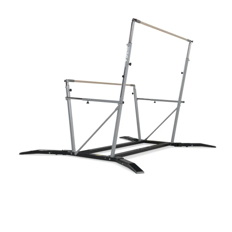 Der Stufenbarren „Club“ kann auch als 1-Holm-Modul eingesetzt und mit einer Reckstange genutzt werden. Zwei Schnellspannvorrichtungen ermöglichen einen leichten Austausch der Holme. Die ausklappbaren Standfüße verleihen dem Stufenbarren eine hohe Stabilität.