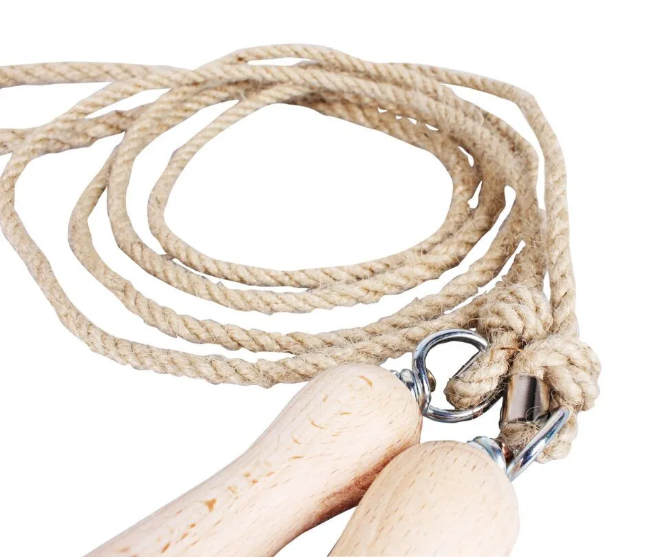 Das Springseil besteht aus 100% Hanf mit Holzgriffen und Drehwirbel. Das Seil ist in der Mitte auf 1 cm verstärkt, die Seillänge ist verstellbar. Die Holzgriffe sind naturfarben und lackiert.