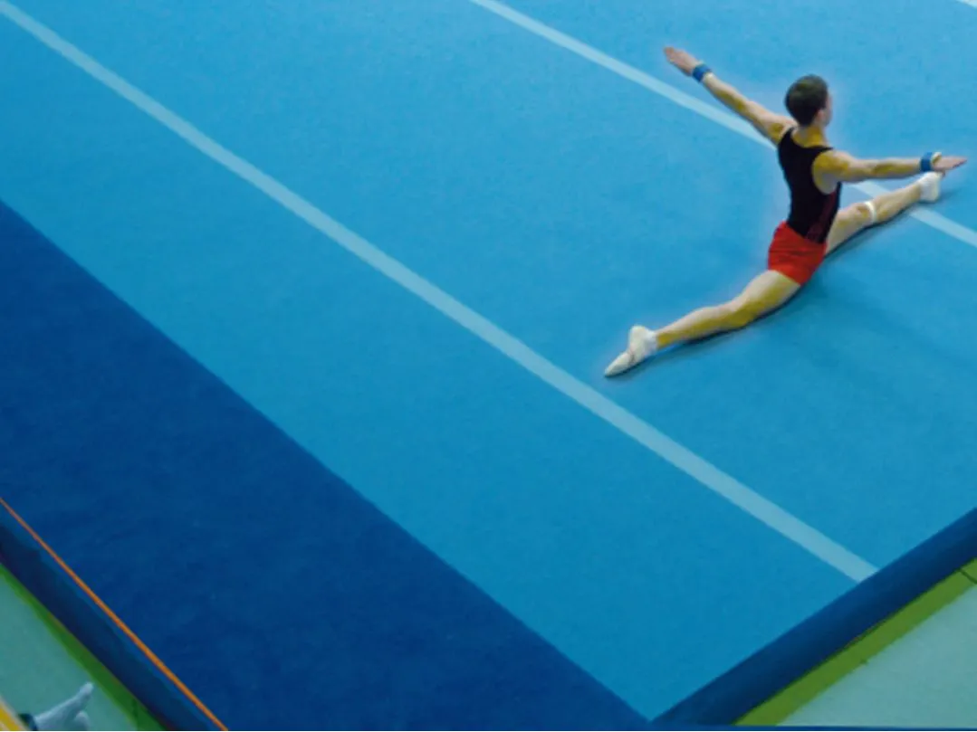 4-teiliger Veloursteppich ca. 14 x 1 m, passend zu Wettkampf-Bodenturnfläche 14 x 14 m , mit Gehrungsschnitt und Haftband zum Befestigen.