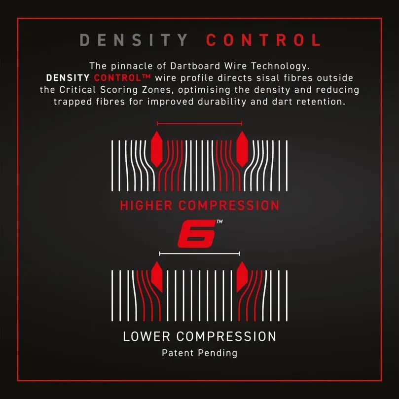 Die wegweisende Verdrahtung des Blade 6 besteht aus dem neuesten Density Control-Draht, der für eine optimale Faserdichte und einen verbesserten Halt der Darts in den Double-, Triple- und Bullseye-Zonen sorgt. Der Draht im 60°-Winkel lenkt die Darts in den Trefferbereich und verringert deutlich die Zahl der Bouncer (Abpraller). Das Bullseye und das Outerbull haben gegenüber dem Blade 5 einen 25% dünneren Draht. Dadurch ergeben sich noch größere Score-Fläche im Bulls und es können leichter höhere Punktzahlen erzielt werden.